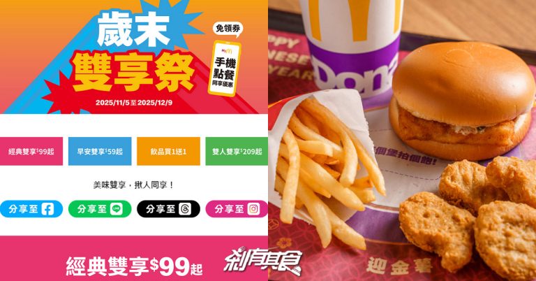 文章最後更新時間: 2025-11-09 / 作者: 小剎 麥當勞買一送一,麥當勞推出「麥當勞優惠券」,11/5~12/9 限時35天,有「早安雙享 59元起」、「經典雙享 99元起」、「雙人雙享 209元起」及「飲品買一送一」等優惠,官網或門市點餐機輸入代碼即可使用,真的超划算啊,優惠券點餐時用手機出示即可,快來一起看看吧~ 最新消息: 👉 最新!拿偏光鏡看的美術展:購票連結 😎 建議先看完整 … 閱讀全文 麥當勞買一送一! 麥當勞優惠券 歲末雙享祭11/5~12/9 限時35天