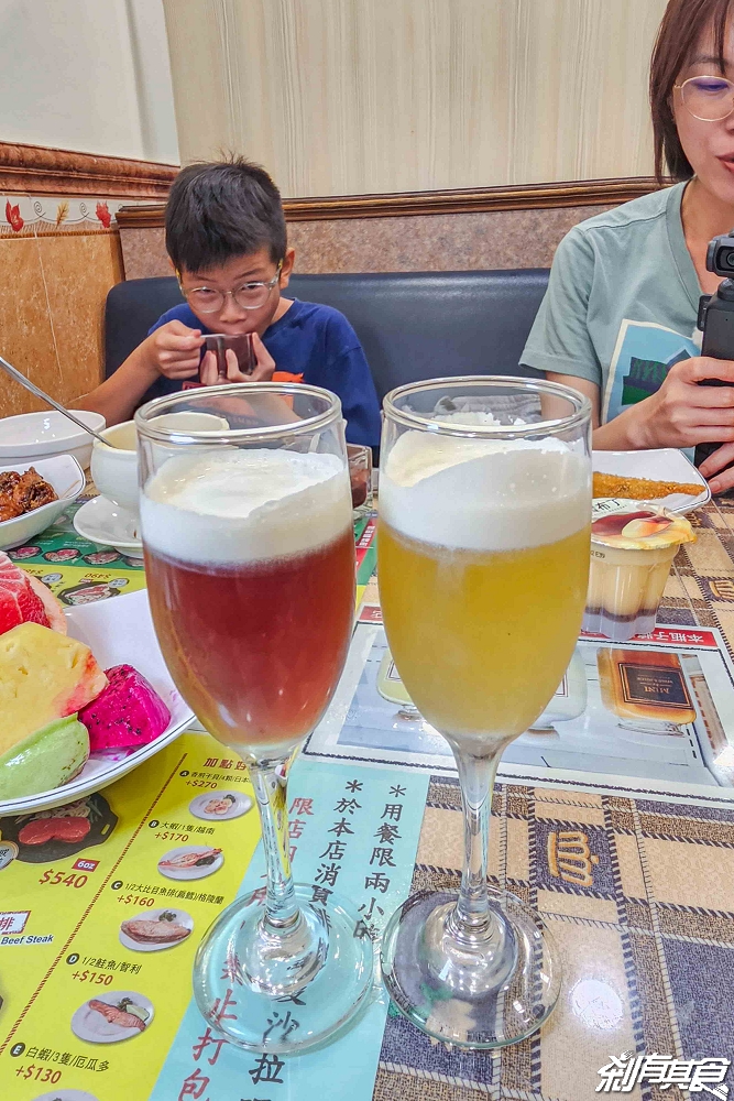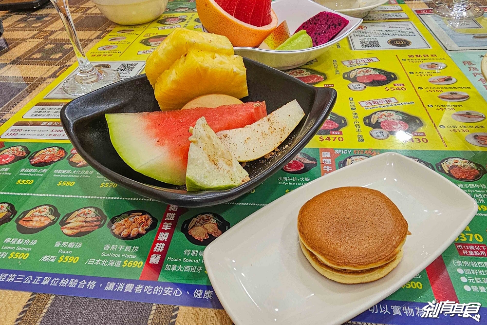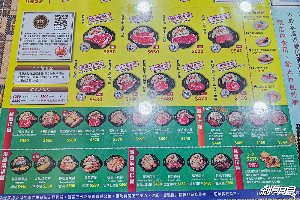 店員帶我們入座之後,就開始介紹菜單及收費方式,超值沙拉吧 250元起(身高100-120cm)、300元(身高121-140cm)、380元 (身高140cm以上),排餐的價格 430元起,包含沙拉吧的費用,也就是說點沙拉吧380元加50元就有一塊牛排啦,CP值果然很高😆