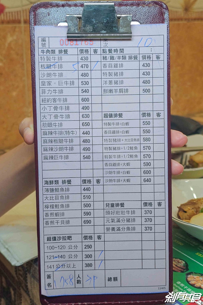 我們點了一份板腱牛排 470元、一個成人沙拉吧 380元、兒童沙拉吧 300元,一共是 1150元。