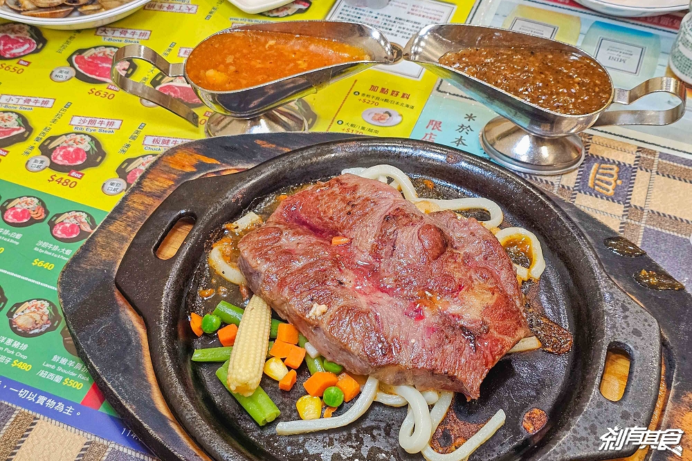 呼~ 終於要來吃牛排了,我點的是「板腱牛排」底下鋪著烏龍麵及三色豆,醬料要自取,有黑胡椒醬、蘑菇醬、A1醬、BB醬、黑胡椒粉都有。
