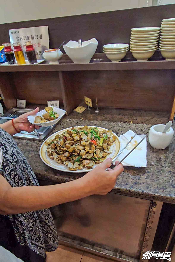 才拿完湯,忽然聽到服務員說「有炒蛤蠣,歡迎取用」,只見檯上多了超大一盤炒蛤蠣,大家很守秩序的排隊取用,我跟亞亞各取到了一盤😆