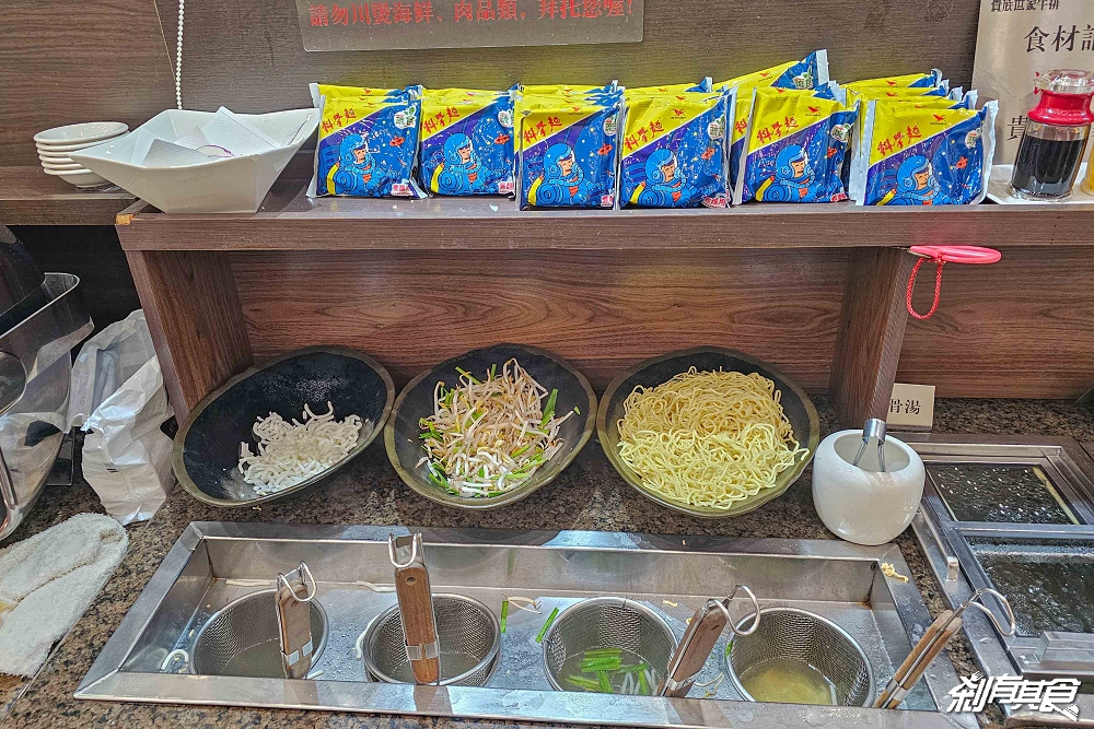 有科學麵、黃麵、白麵,也可以燙青菜,加了旁邊的大骨湯就可以做成湯麵👍