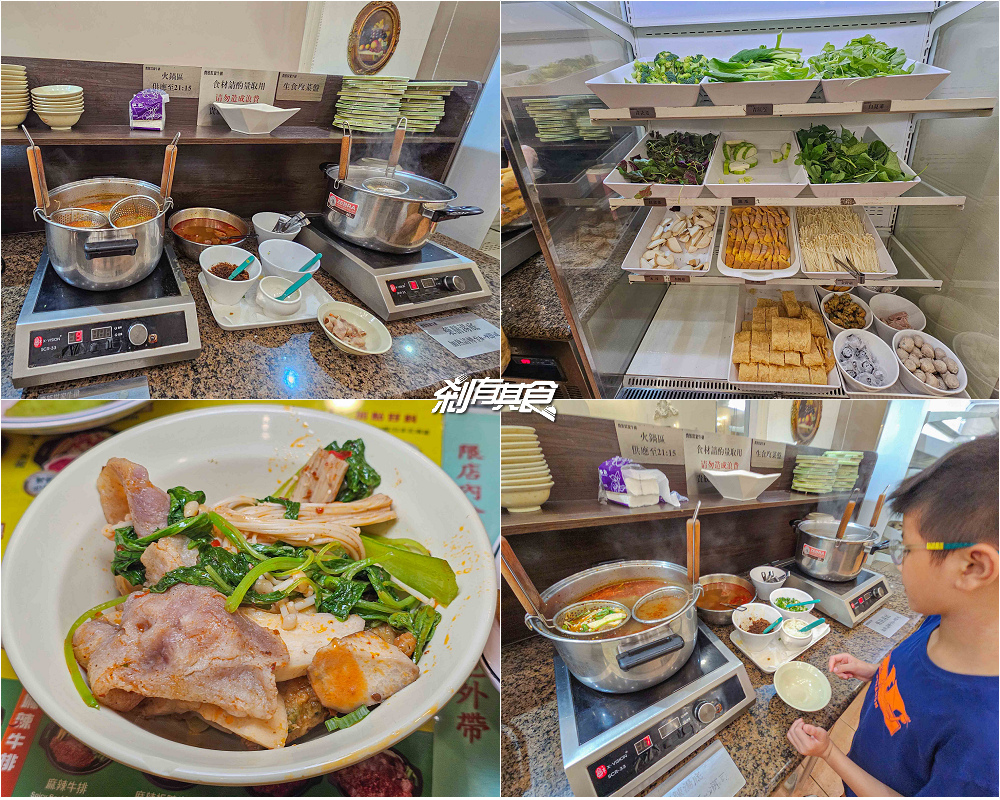 火鍋區可以自己夾肉片、蔬菜、火鍋料來川燙,有辣跟不辣兩鍋湯,我覺得可補充一下蔬菜這點很棒,均衡一下才不會吃太多、消化不良。