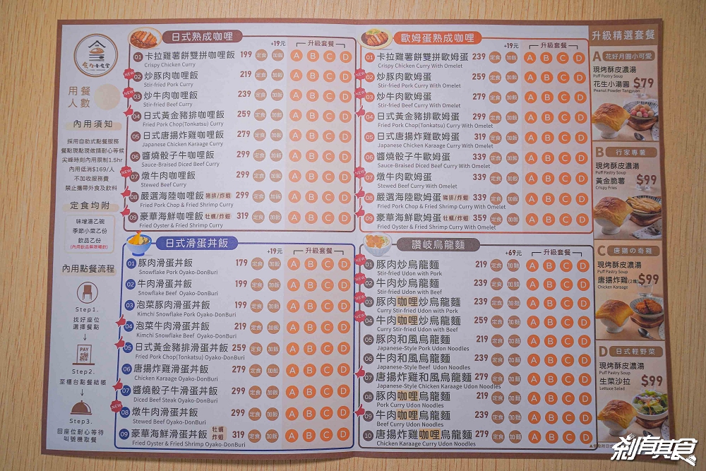 「食力小食堂」餐點以定食的方式呈現,主要分為「日式熟成咖哩、日式滑蛋丼飯、歐姆蛋熟成咖哩、讚岐烏龍麵」4大類,各有8種以上的品項可選,最新推出輕食族最愛的「生菜沙拉定食」,還能加價升級套餐,附湯直接變成酥皮濃湯,選擇真的很豐富👍