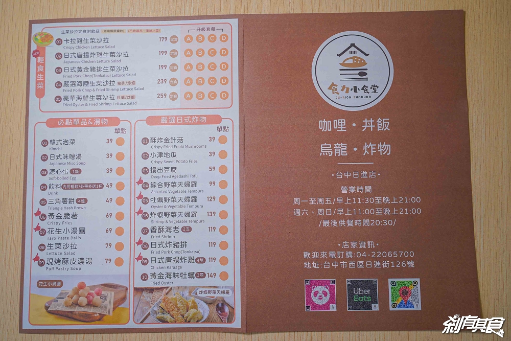 今天小剎來介紹台中西區美食,這家在網路上有4.9分好評的隱藏版日式暖心食堂「食力小食堂」,提供日式熟成咖哩、日式滑蛋丼飯、歐姆蛋熟成咖哩、讚岐烏龍麵,最新推出輕食族最愛的「生菜沙拉定食」,還能加價升級套餐,附湯直接變成酥皮濃湯,好吃又選擇豐富,內用還有冬瓜檸檬、紅茶無限暢飲,環境舒服、一個人也能吃,下午沒休息、好停車,台中日式料理大家快一起來看看吧~