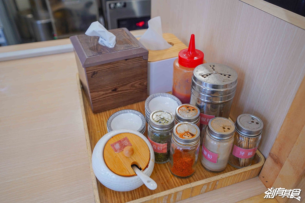 旁邊有各式調味料,像胡椒粉、辣椒粉、辣油…等,可以自己拿。