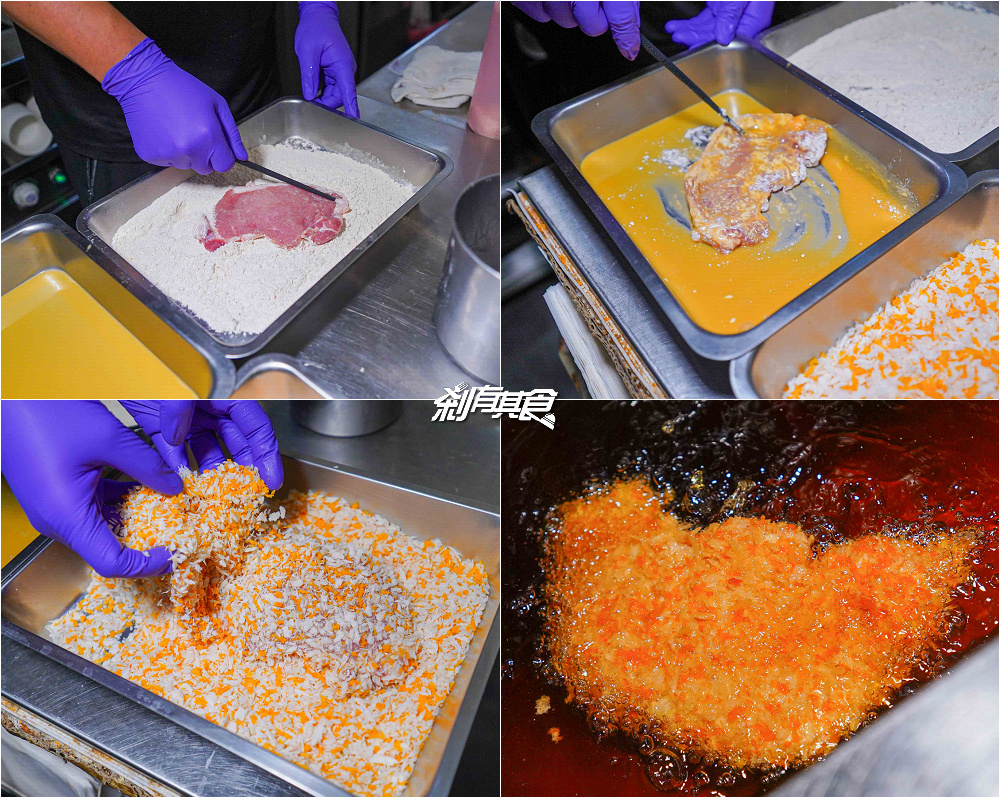 「日式黃金豬排歐姆蛋咖哩飯」是店內的人氣菜色,評論中10組客人有7組會點,大家都這塊黃金豬排,今天就帶大家看看製作過程,現點現炸,從豬肉沾粉開始,再沾蛋液、酥炸粉後再去炸,炸到金黃酥脆才算完成。