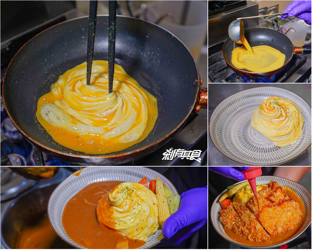 另一邊師傅又開始製作歐姆蛋,是旋轉蛋包那種耶!看起來漂亮極了,接著再擺盤,倒入每天精心熬煮的日式熟成咖哩,放上剛炸好的豬排、並淋上豬排醬就可以上桌了。