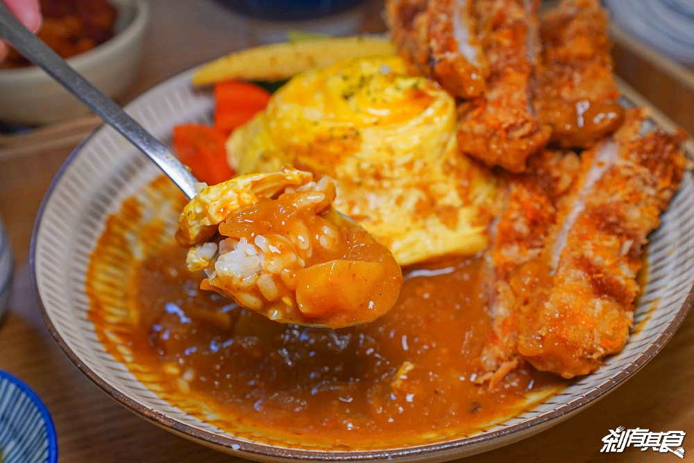 「日式熟成咖哩」相較於東南亞的咖哩,辣度溫和許多,明顯的甜味是日式熟成咖哩的特色之一,因為有加入炒過的洋蔥、蘋果或是蜂蜜,及多種辛香料再經過時間熟成,讓各種香氣味道更融合且更濃郁,吃起來帶些甜味,是大人、小孩都能接受的味道,再配上滑嫩的旋轉蛋包,真的很滿足!