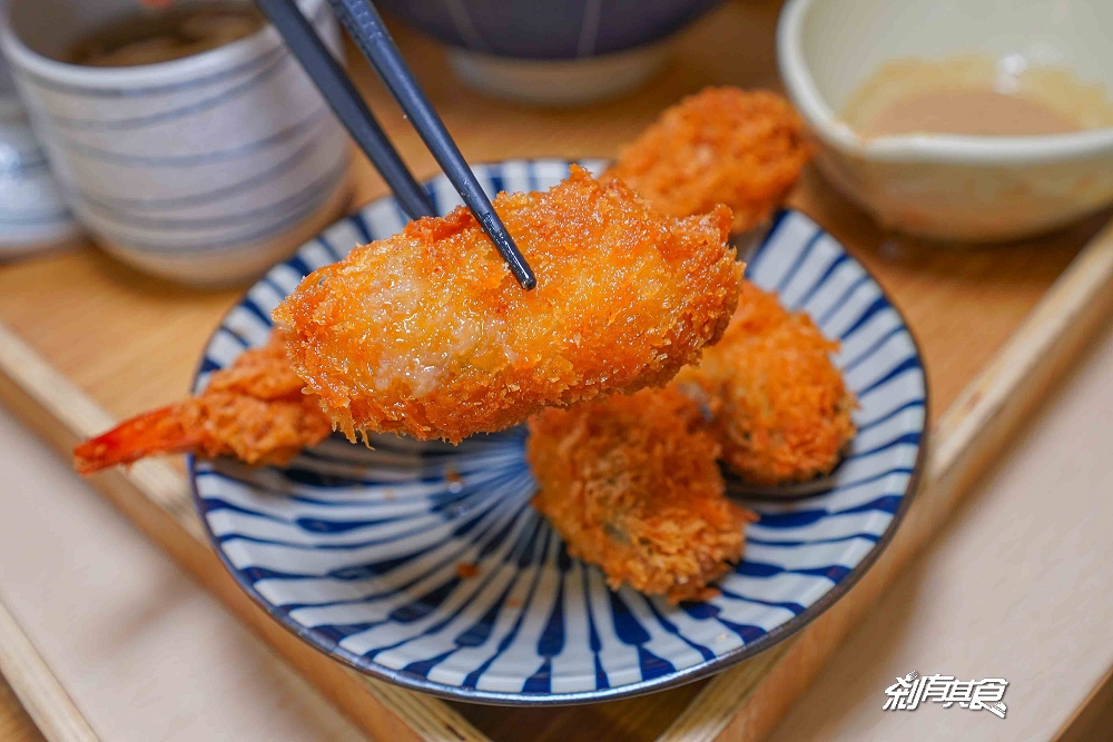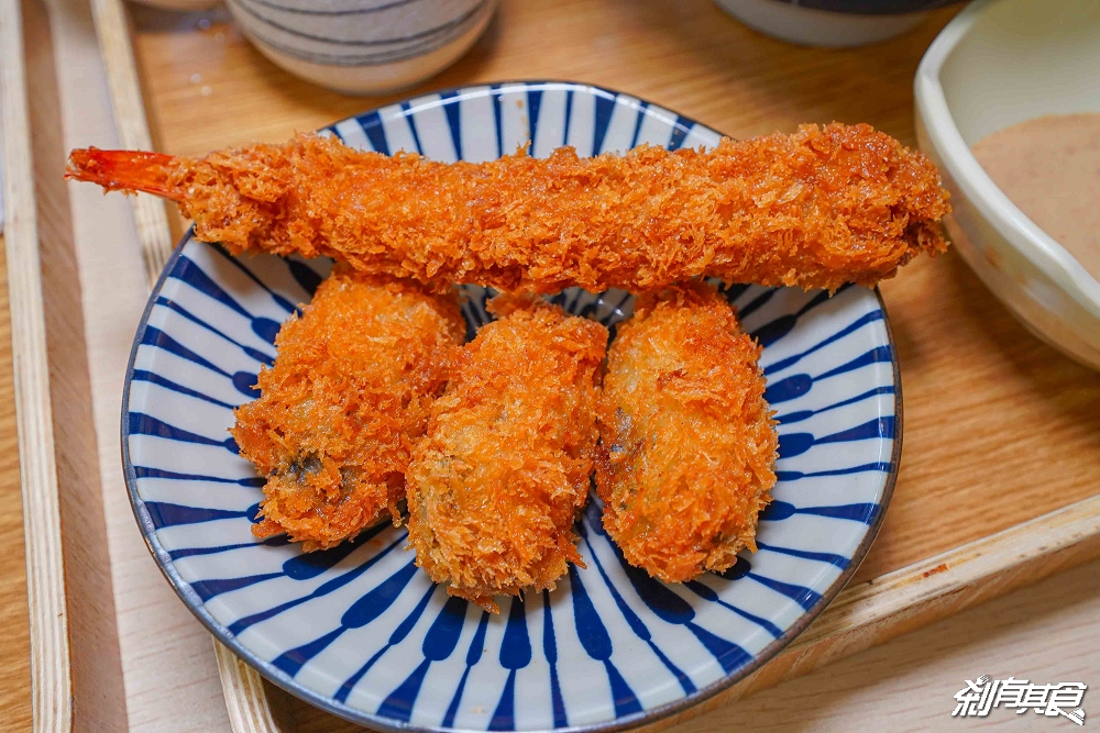 有炸蝦跟3顆炸牡蠣,炸蝦外酥內Q彈,沾點胡麻沙拉醬能中和炸物的油感,增添滑潤口感。