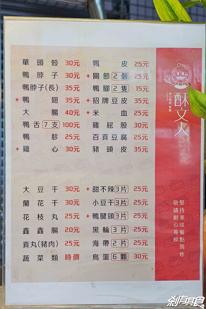 放上菜單給大家參考,食材種類蠻多的,經典的鴨頭、鴨脖子、鴨翅、鴨皮、鴨腳、鴨舌、鴨腱頭全都有,必點的「甜不辣、雞心、招牌豆皮、米血」也別忘了拿!