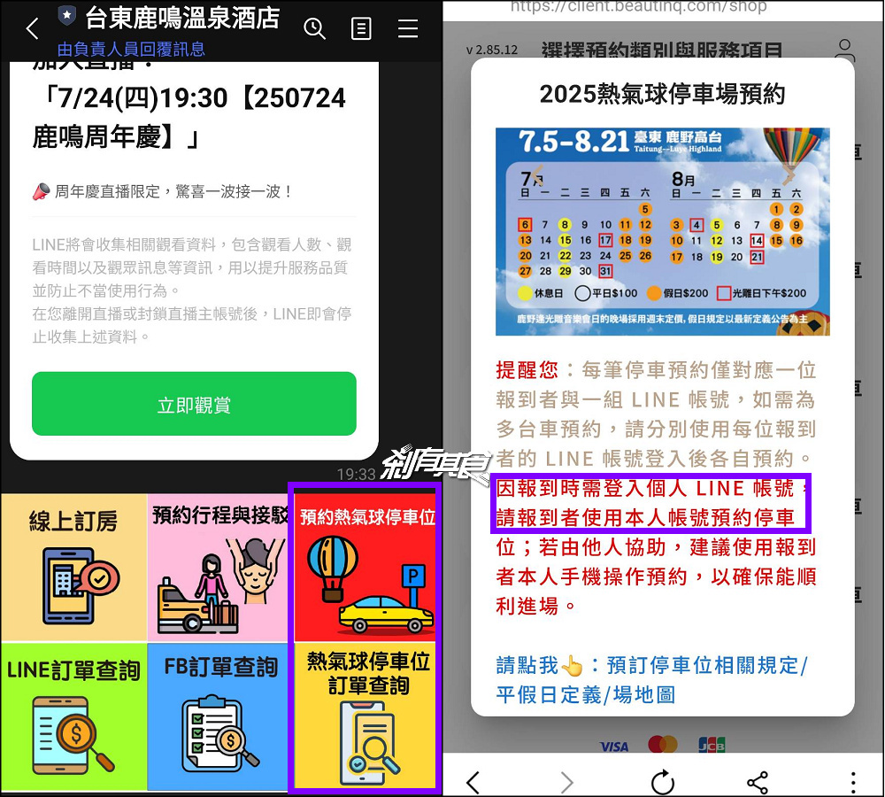 加入停車場預約LINE之後會出現這個畫面,點選右邊的「預約熱氣球停車位」,然後信用卡付款後可保留停車位,平日 100元、假日/光雕場 200元,停車時需出示「預約者的line預約成功畫面」才能停車。