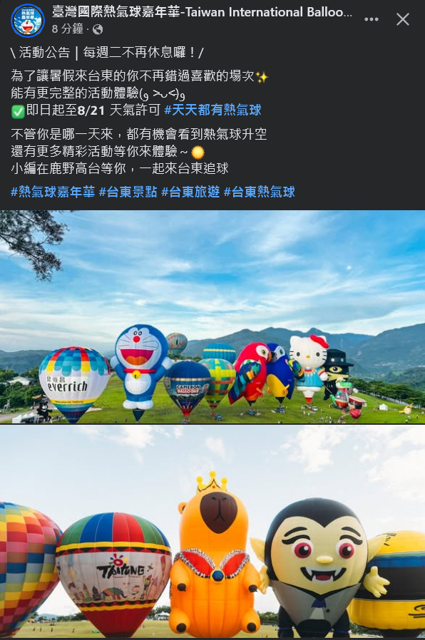 A:2025.7.5~8.21 (每週二公休),早上場 5:30~7:00、下午場 17:00~18:30 只要沒有公告取消的時間都有,不過非活動時間外就沒有熱氣球可以看囉~ 這也是沒有參加過的人的共同疑問。