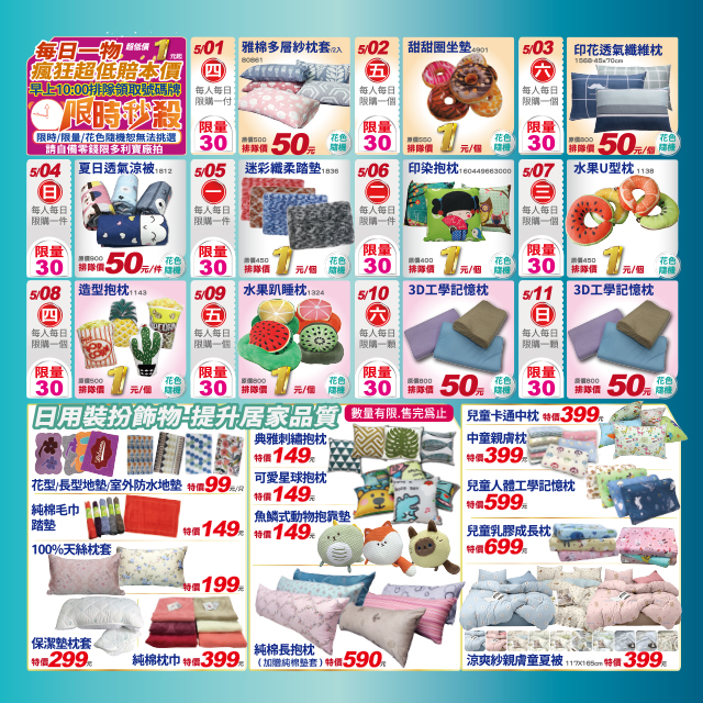 每日一物瘋狂超低價,50元的枕頭、50元的法蘭絨休閒毯、1元的踏墊、1元的甜甜圈坐墊….等著你來搶購,每日早上10點排隊領取號碼牌,記得要自備零錢喔~