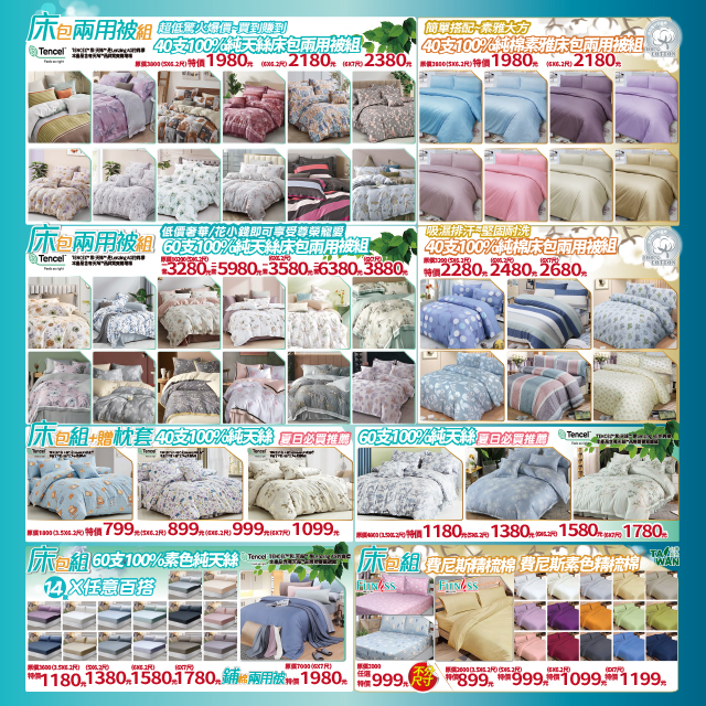 60支100%天絲印花床罩組 4980元起、40支100%精梳棉印花床罩組 5480元起。