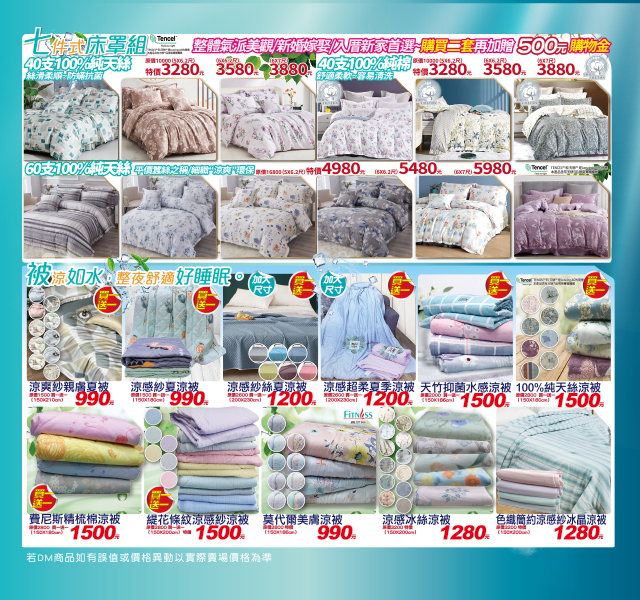 純天絲床包組、涼被、床罩組通通都有優惠。