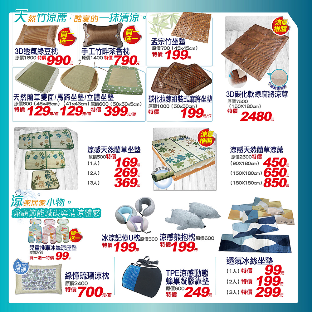 枕頭買一送一、冰涼記憶U枕199元、涼蓆、涼被、涼墊…等,驚喜冰涼價非買不可。