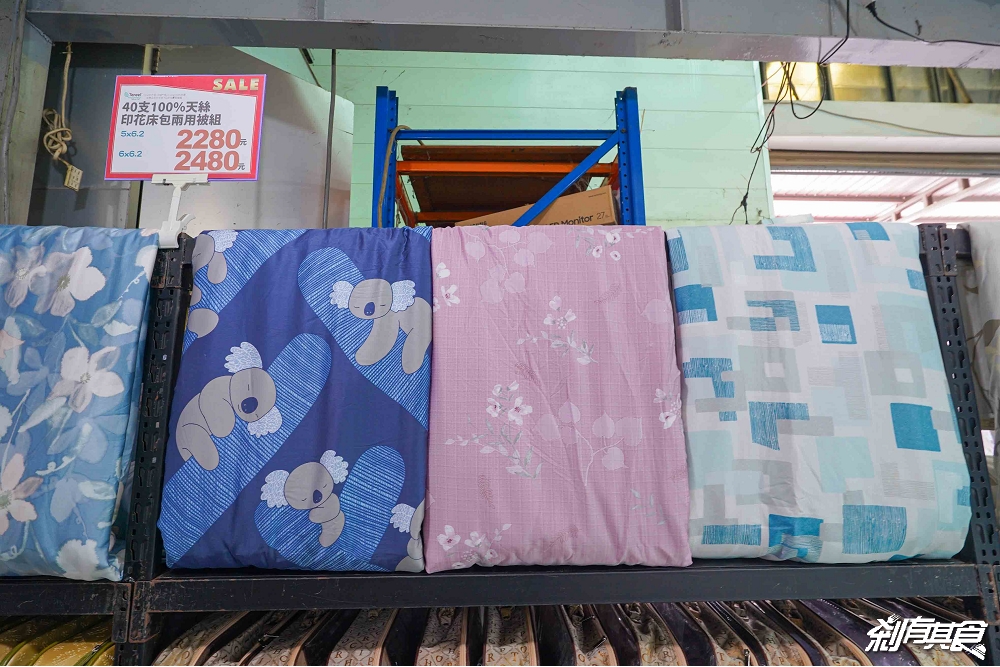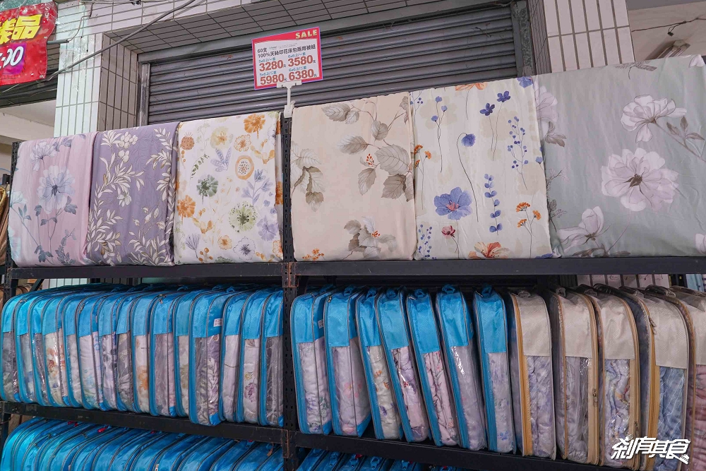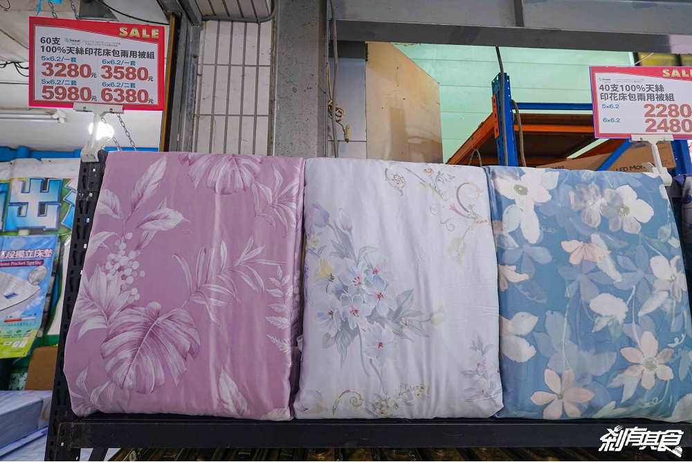 床包區佔了一大半,有分「純棉、天絲」等材質,天絲又細分出「40支天絲、60支天絲、100支天絲」等在這裡都有展示,可以摸得到質感,另外架上都有清楚的標示出尺吋及價錢,花色不只有架上展示的,下面的床包都可以拿出來看。