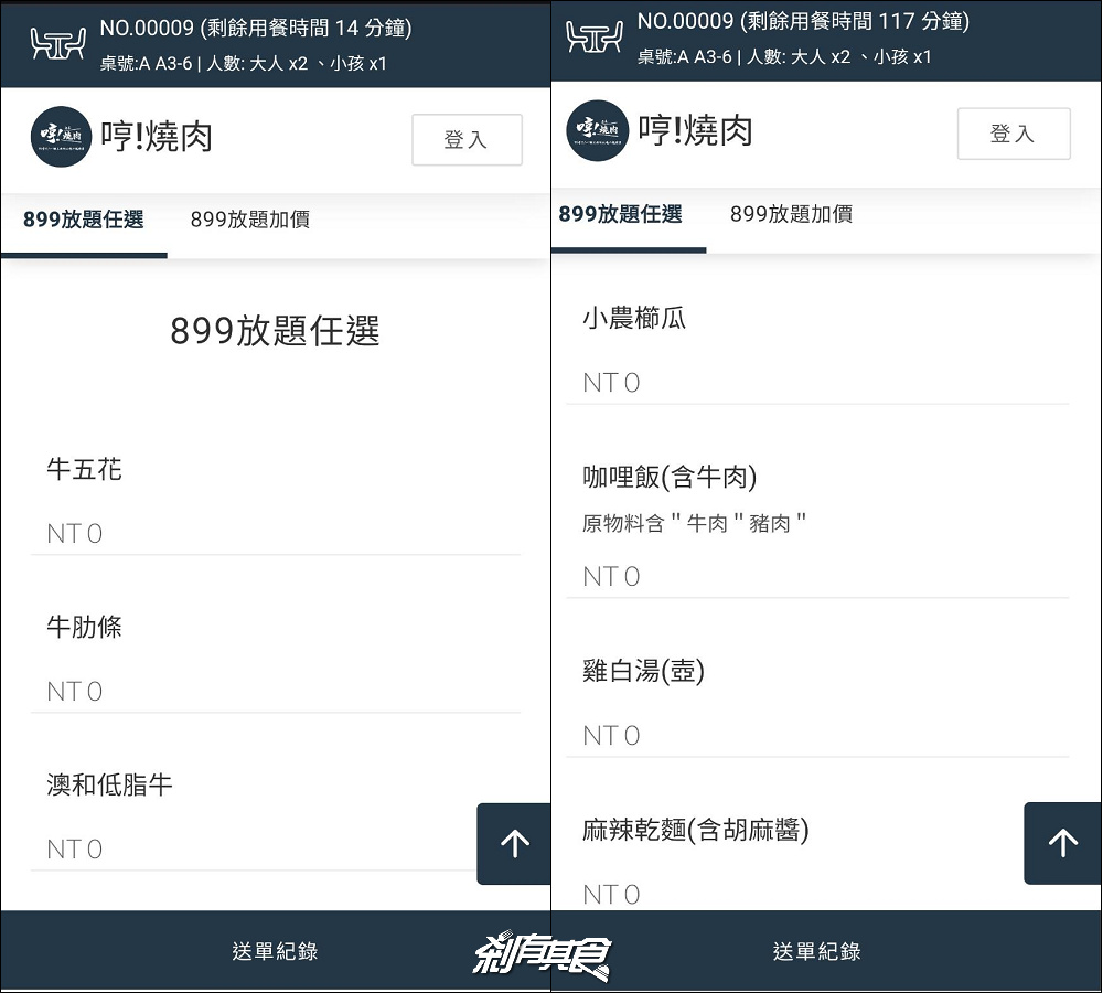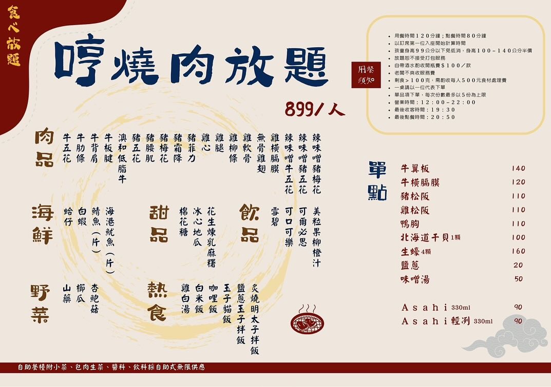 每人899元,有牛、豬、雞肉及海鮮、蔬菜可選,還有熱食、甜點、飲料加起來40種品項通通吃到飽,不收服務費,用餐時間120分,點餐80分鐘。