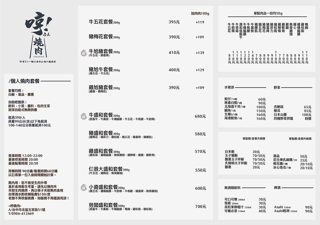 基本上以一人燒肉為主,每座位旁都有設置活動隔板,一坐下馬上變成自己的燒肉小天堂的感覺,另外也有4人桌,所以跟朋友約吃燒肉是很ok的,晚上開到晚上10點。