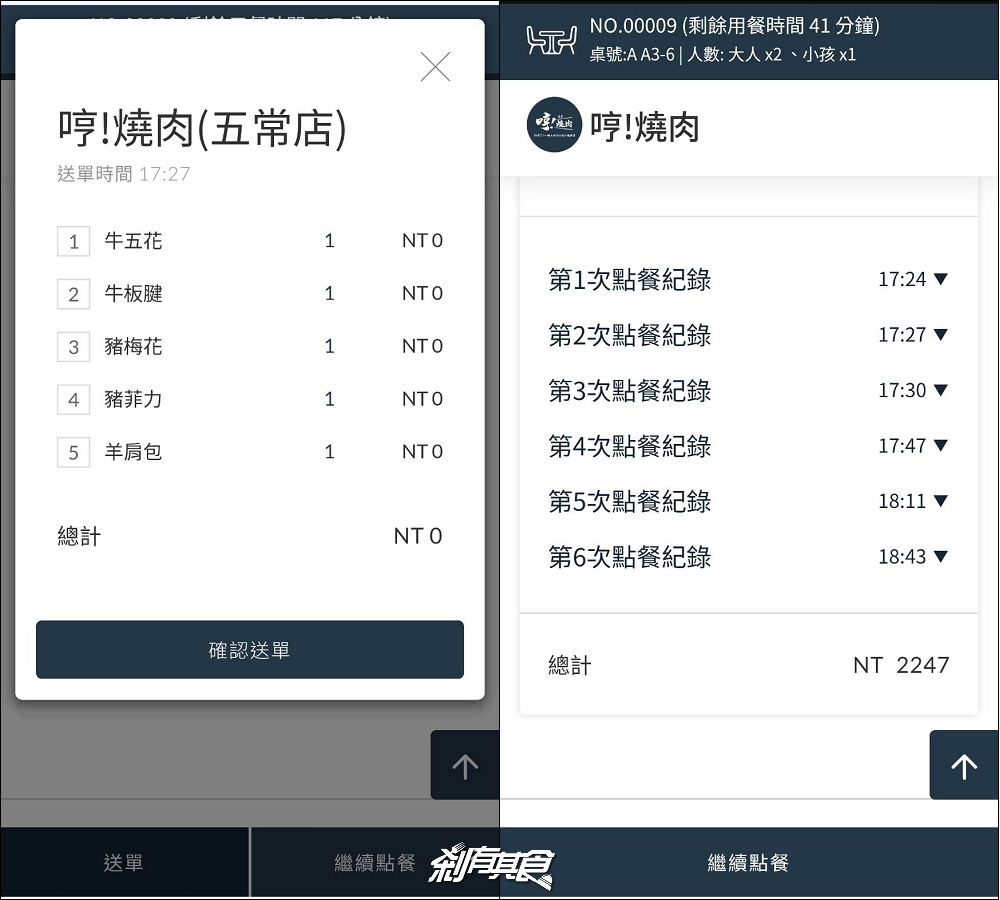 「哼燒肉」採「手機點餐」,想吃什麼就直接點起來,服務人員會幫你送上來,每次點餐最多5份為限,不過沒有限制幾分後才能再點餐,所以大家能自己掌控時間、烤肉節奏,很讚啊!