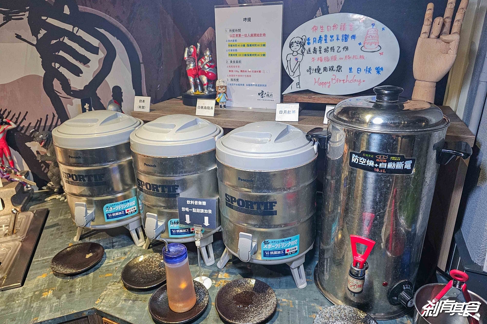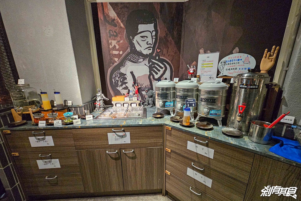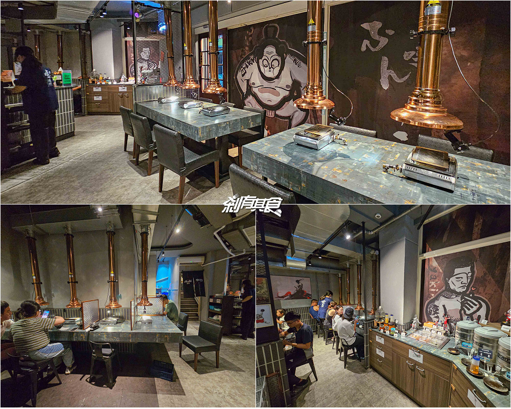 「哼!燒肉五常店」風格跟朝富店完全不同,老闆笑說走的是「日本中二風」,牆上有很多日本動漫元素,像是哥吉拉、鹹蛋超人(超人力霸王)、武士、相撲、阿基拉…等等,就差沒有假面騎士了
