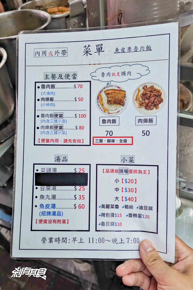 主打是魯肉飯、肉燥飯,也可以做成便當(有三種小菜),另外老闆推薦必點的是「魚皮湯」,還有荷包蛋、魯鴨蛋…等小菜可以加點,不需要劃單直接跟店員點餐,吃完再買單即可。