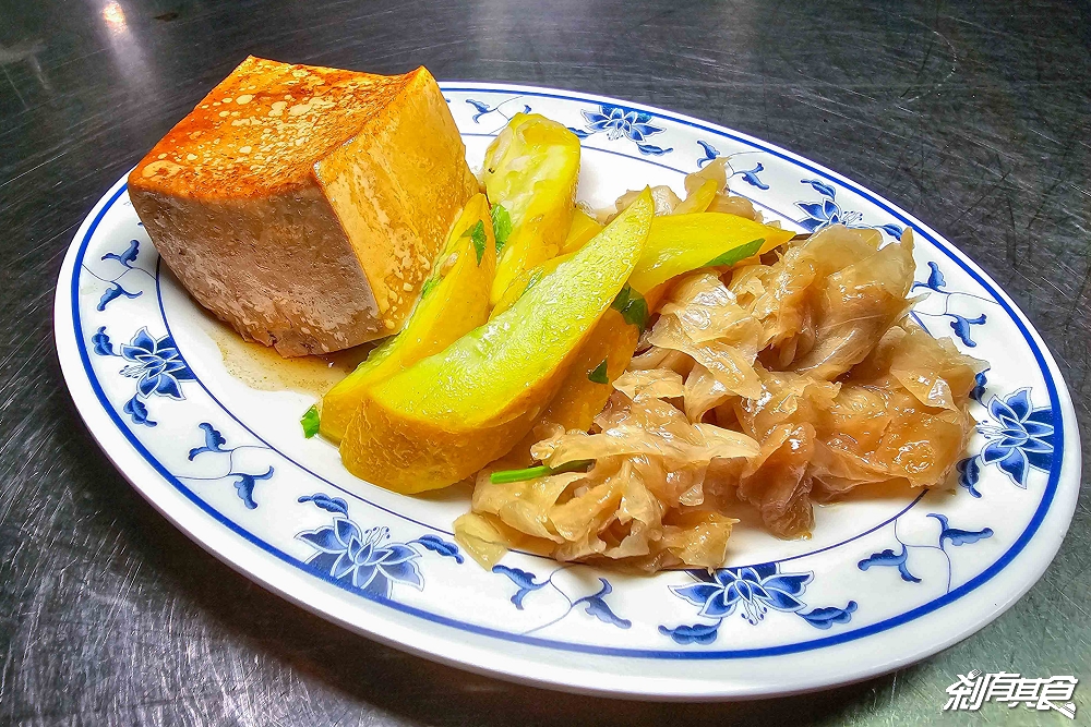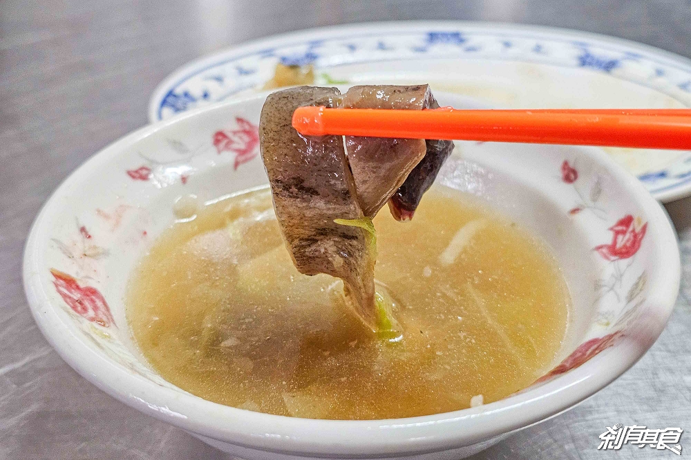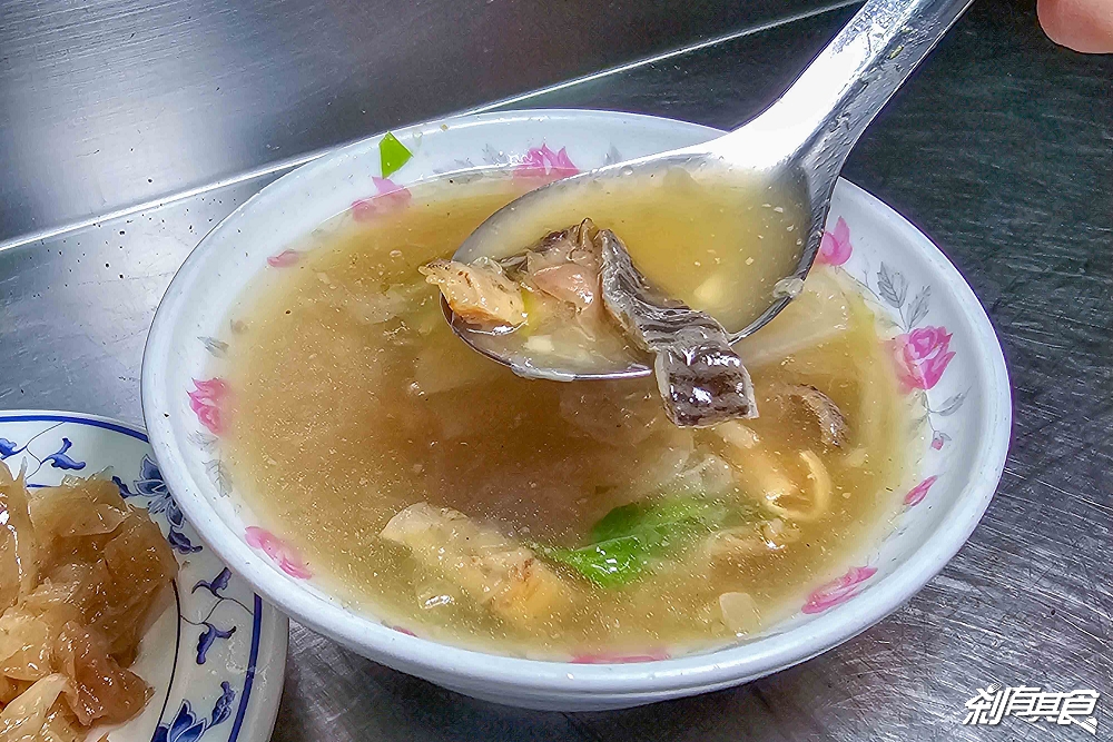 「魚皮湯 60元」,身為一個魚皮湯愛好者當然要點起來,不過看到本體發現跟台南那種魚皮湯不同,比較像平價清爽版佛跳牆,裡面有切成條狀的魚皮,再加入白菜、筍絲等口感很豐富,湯頭帶扁魚香並且有一點膠質感。